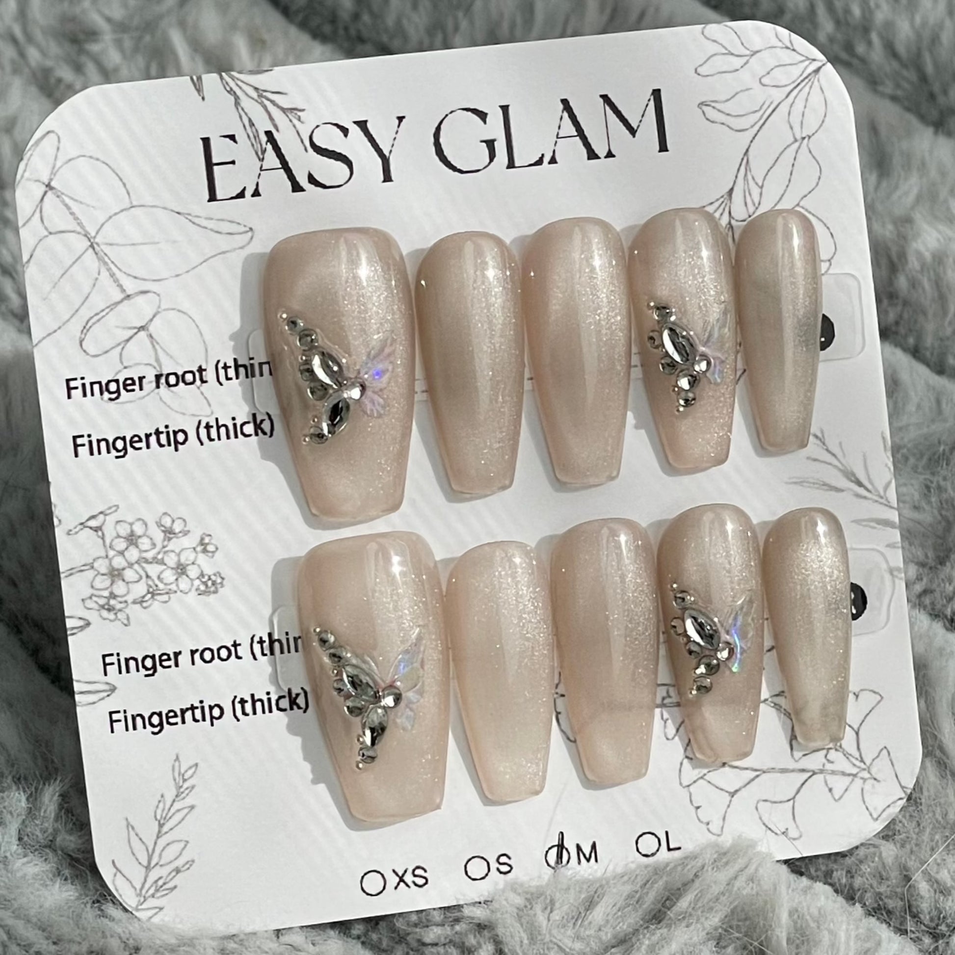 Embrace the enchanting beauty of these butterfly-themed press-on nails. The pearly white base, adorned with intricate crystal butterfly designs, creates a magical and captivating look. Perfect for adding a touch of whimsy and elegance to your style.