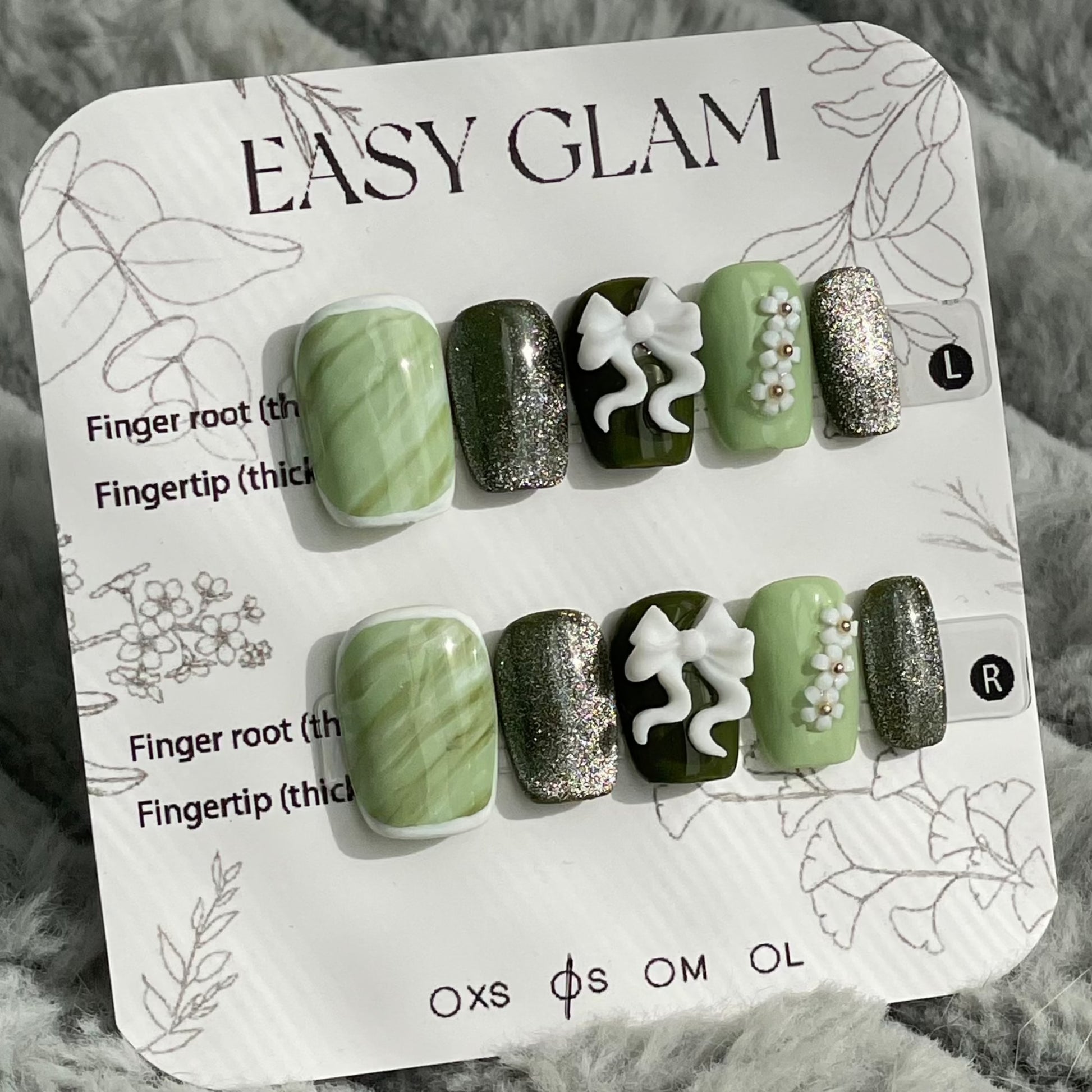Step into a magical world with these enchanted green press-on nails. The mix of dark and light greens, combined with glittery accents and 3D white floral designs, creates a whimsical and enchanting look. Perfect for nature lovers and those who want to bring a bit of fantasy into their style.